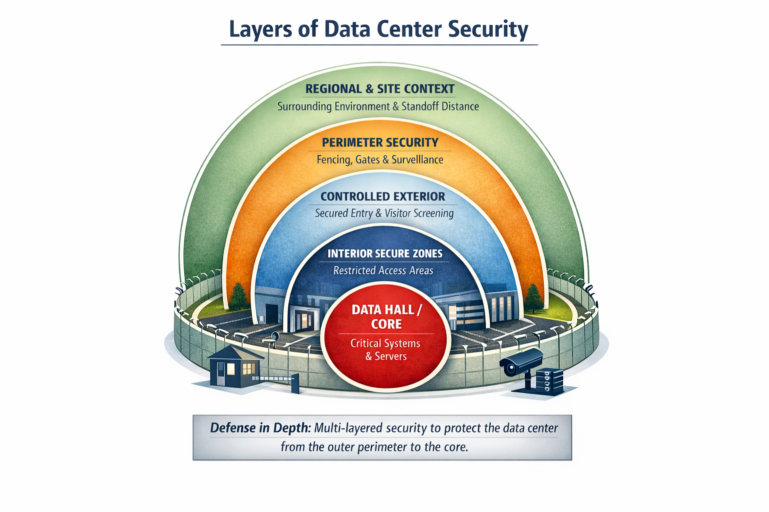 In today’s threat environment, data centers can no longer rely on a single perimeter or isolated control to safeguard critical infrastructure. Instead, the industry has increasingly adopted the concept of concentric security circles, also known as layered defense-in-depth, as a foundational design and operational strategy. This model establishes multiple, progressively restrictive zones of protection that surround the facility’s most critical assets, ensuring that threats are deterred, detected, delayed, and ultimately defeated long before they can reach sensitive systems.